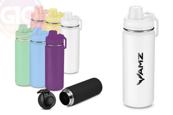 Garrafa em aço inox com capacidade de até 780 ml. Tampa rosqueável com anel de silicone, alça plástica em formato de mosquetão e bico rosqueável para fácil acesso. Design com frisos na tampa e pintura pó. 1 Gravação já incluso.