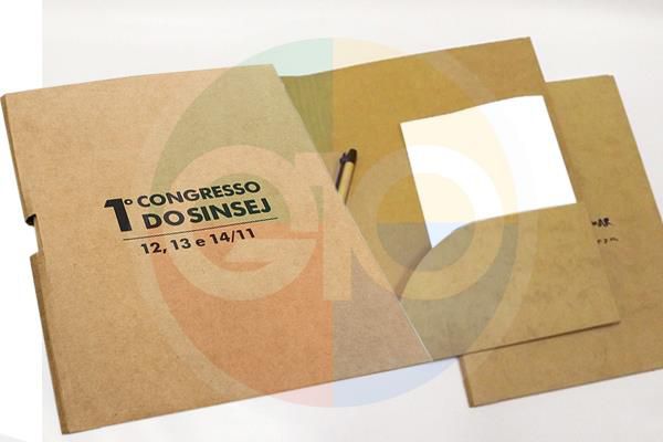 Pasta com bolso em papel kraft 350gr, impressão em 1 cor já incluso, acabamento: faca modelo gráfica, corte/vinco e colagem. Medidas: 24x30,5cm. * IMAGEM ILUSTRATIVA.